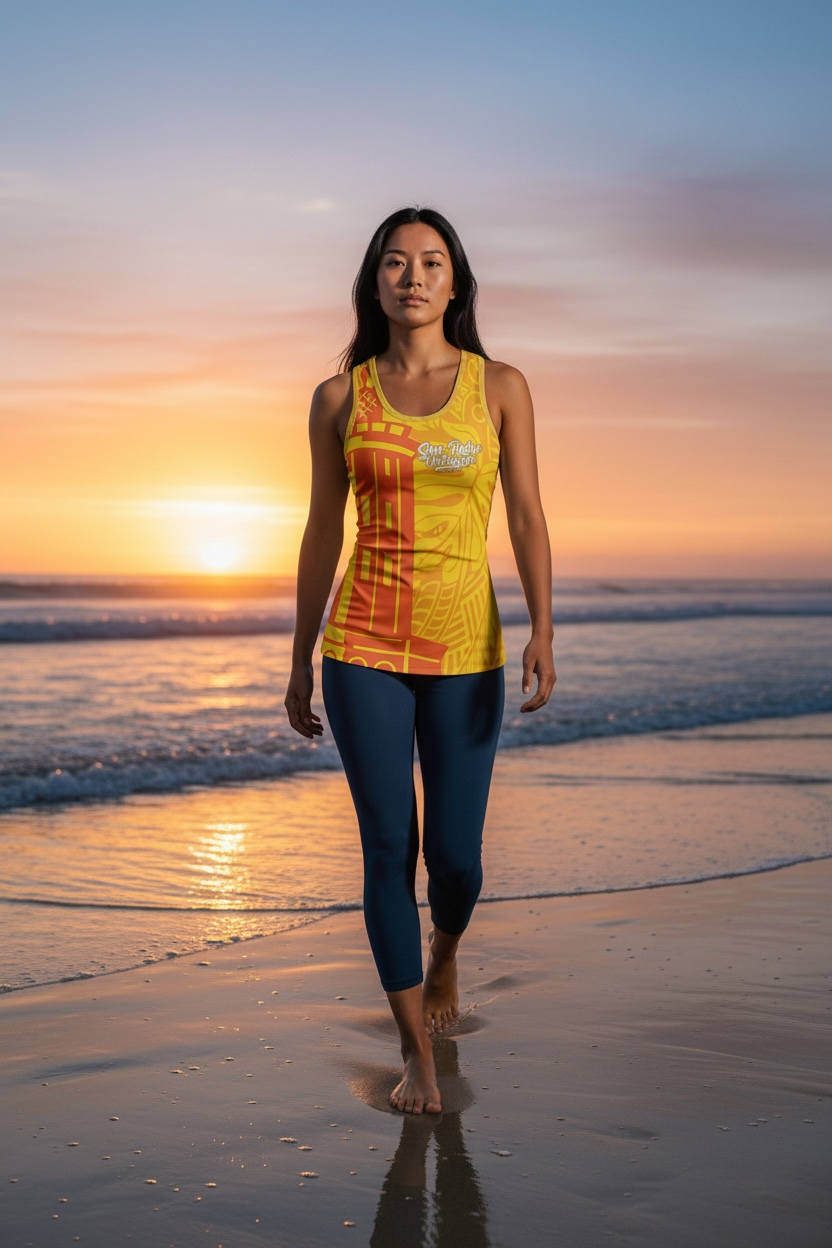 This wahine racerback dry-fit jersey features the historic Point Fermin Lighthouse in San Pedro, CA. Built in 1874 to guide ships, it continues to inspire the San Pedro Outrigger Canoe Club and serves as a reminder of our connection to San Pedro Bay.